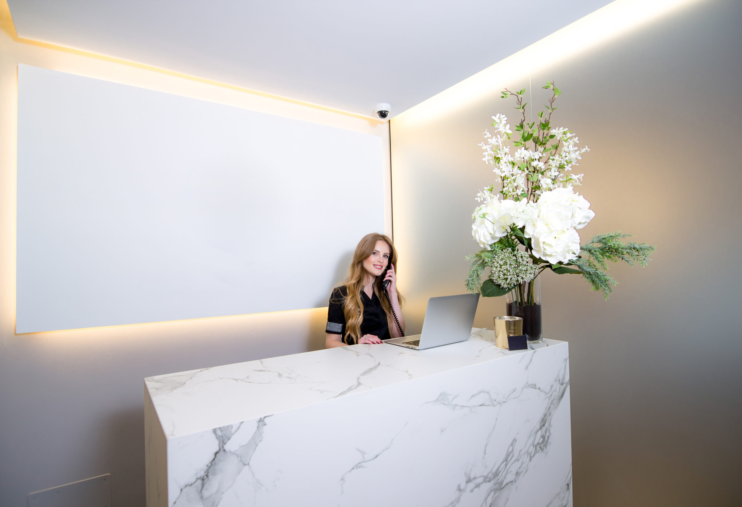 Young receptionist talking on the phone in modern clinic. Blank white poster with copy space in the background.Young receptionist talking on the phone in modern clinic. Blank white poster with copy space in the background.